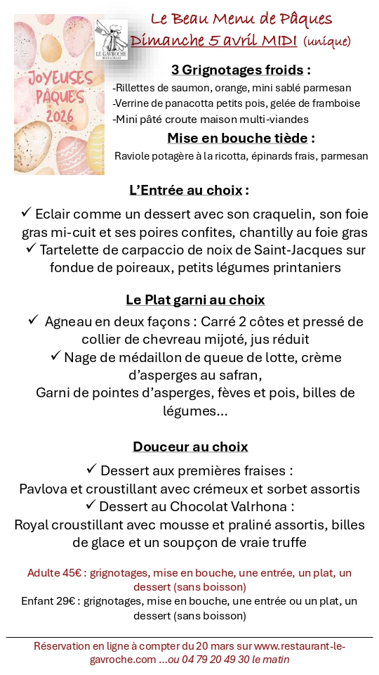 Servi dimanche 5 avril à midi. Menu unique sans changement possible. Réservation en ligne ci-contre avec le choix à noter à la réservation. Merci !
